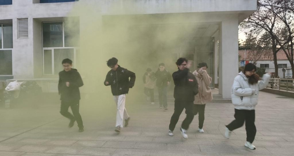 演练之前,安全保卫处专业人员对安全员们进行了消防安全培训,强调了火灾应急逃生程序、路线及注意事项。随着实训楼外燃起浓烟模拟火灾发生,消防警报响起,师生捂住口鼻,低姿弯腰,在各楼层安全员的指引下,有序前进,按照预设的疏散路线撤离。到达安全区域后,指挥人员引导学生集中并清点人数,整个过程快速、有序。