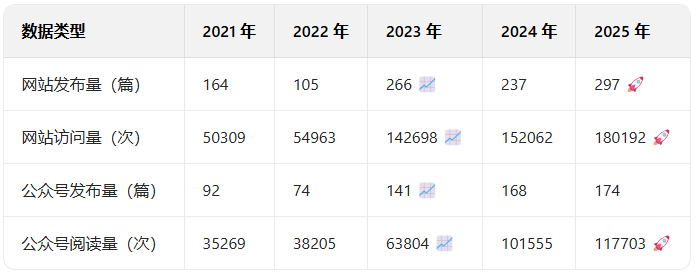 自 2021 年至 2025 年,宣传工作实现跨越式发展。网站内容由 164 篇增至 297 篇,访问量从 5.03 万提升至 18.02 万;公众号推文由 92 篇增长至 174 篇,阅读量从 3.53 万突破至 11.77 万。