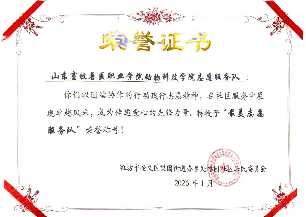 近日,在奎文区梨园街道樱园社区举办的年度总结表彰大会上,我院“逐梦红星·牧兴乡村”社会实践队被授予“社区最美志愿服务队”称号。